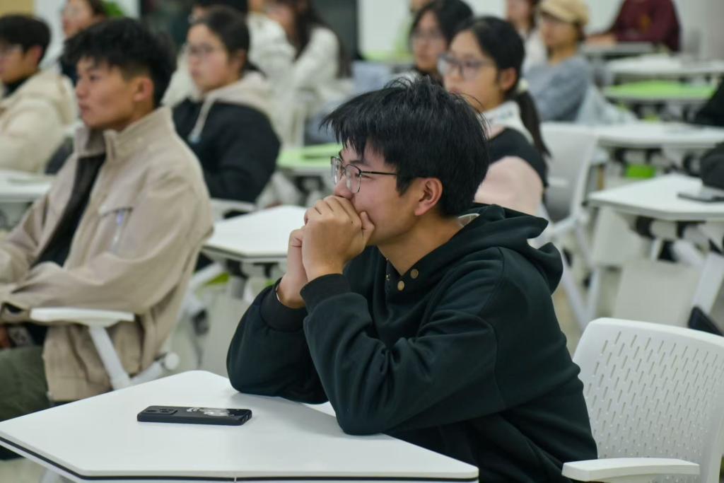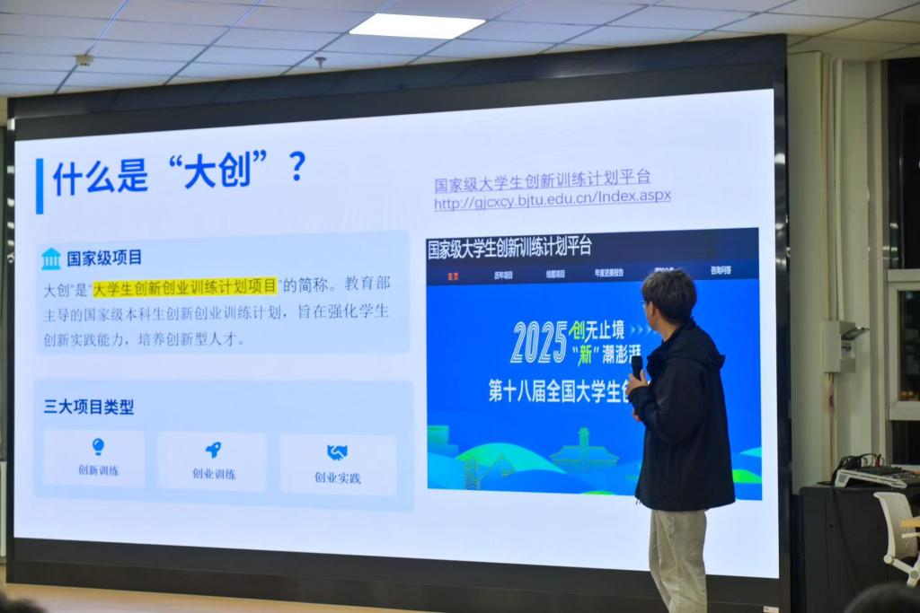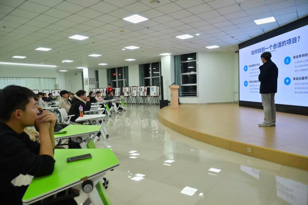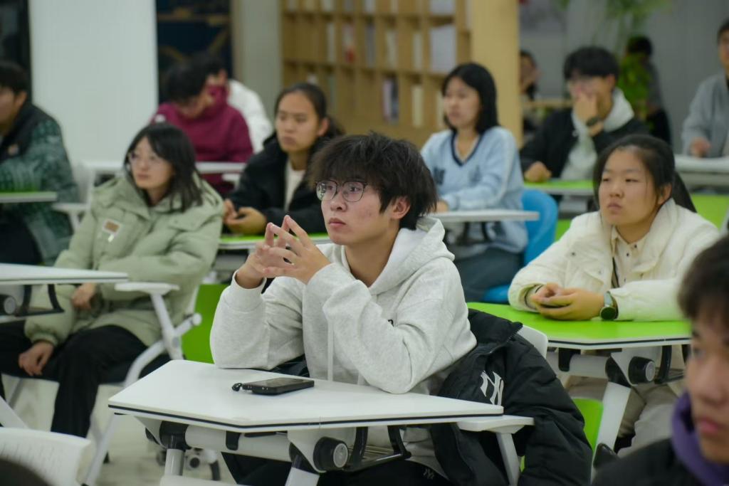 分享会上,曹鹏程同学结合自身丰富的项目申报与实践经验,为在场同学带来了一场系统而实用的专题分享。他首先阐述了参与创新创业项目与科研竞赛对于对于大学生提升综合素质、构建知识体系的重要意义,有效激发了同学们的参与热情。随后,他聚焦“项目计划书撰写”这一核心环节,围绕选题定位、创新挖掘、团队组建、可行性分析等关键步骤,系统讲解了撰写逻辑与规范要求,并分享了诸多实用技巧与常见误区。他鼓励大一同学积极尝试、勇于实践,在实践中锻炼能力、积累经验。互动环节中,曹鹏程就选题方向、时间管理与资源整合等问题与同学们深入交流,其专业的见解与真诚的分享赢得了现场阵阵掌声。